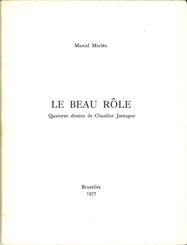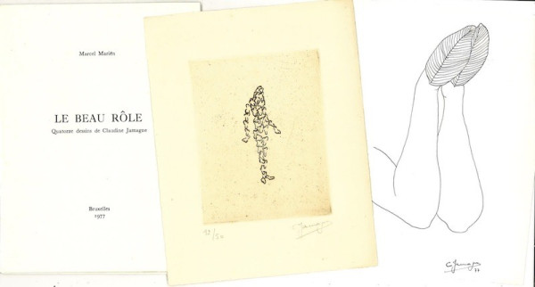 Bruxelles, Isy Brachot et Tom Gutt, 1977, illustré de 14 dessins de Claudine Jamagne, 21 X 16 cm. Un des 50 exemplaires sur vergé Ingres d’Arches accompagnés d’une gravure originale de Claudine Jamagne, numérotés, n°XII, signé par Marcel Mariën et Claudine Jamagne Enrichi d’un dessin originale à l’encre signé et daté 1977 de Claudine Jamagne (16537 FD)
