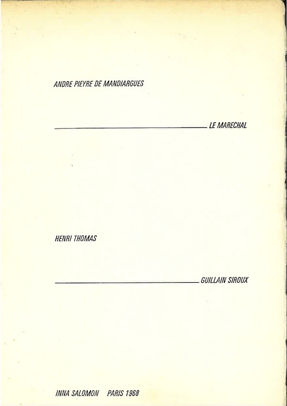 Paris, Inna Salomon Gallery, 1968, 23.5 x 15.5 cm. 1 black manner by Le Maréchal, 1 etching by Guilain Siroux. Sent by Guilain Siroux (248 ED).