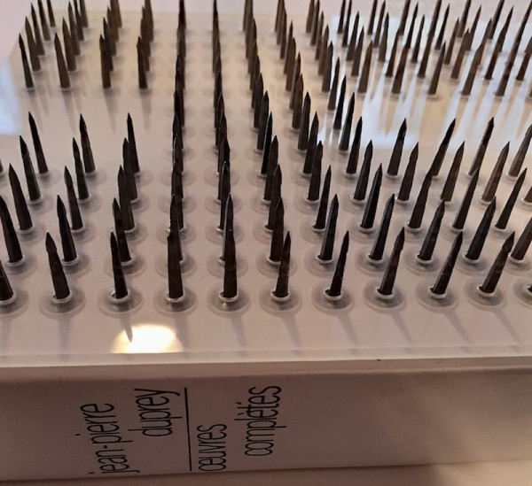Object book created by Atelier Duval. Box covered with plexiglass with planted closures forming the letter H.