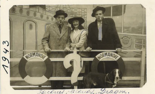JACQUES PREVERT, CLAUDY CARTER, FRANCOIS RAIF AND THE DRAGON DOG, 1943 Black and white print on postcard, 9 x 14 cm. Annotations on the back “Nice Fair/43/with Henri Francois Raif/well-known writer now” (TP2)