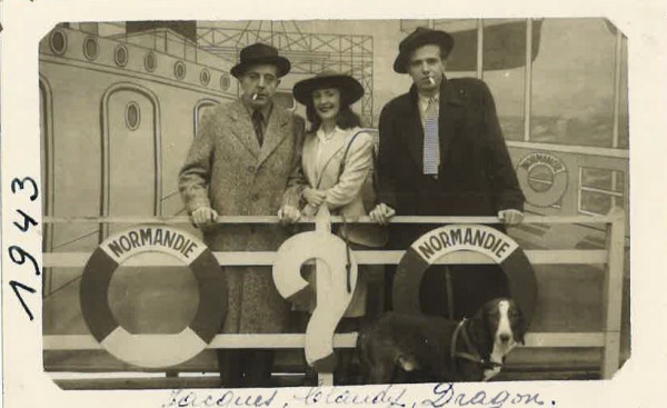JACQUES PREVERT, CLAUDY CARTER, FRANCOIS RAIF AND THE DOG DRAGON, 1943 Silver print on postcard, 9 x 14 cm. Annotations on the back “Fair Nice/43/with Henri François Raif/well-known writer now” (TP2)