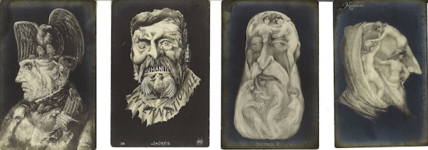 Arcimboldesque postcards, 1910-1920 Print on postcard, 14 x 9 cm. – Napoleon I, No. 67 – Jaurès, No. 38, International Humanity – Leopold – Mephisto Some alterations to the edges