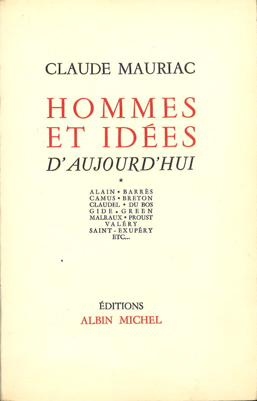 Alain – Barrès – Camus – Breton – Claudel – Du Bos – Gide Green – Malraux – Proust – Valéry – Saint-Exupéry Paris, Albin Michel Editions, 1953, 19 X 12 cm., 356p. Author’s dedication to André Breton (17041 FD).
