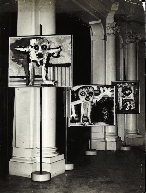 Shot of the display during the Baj exhibition at the Schettini Gallery in Milan from October 10-25, 1954
