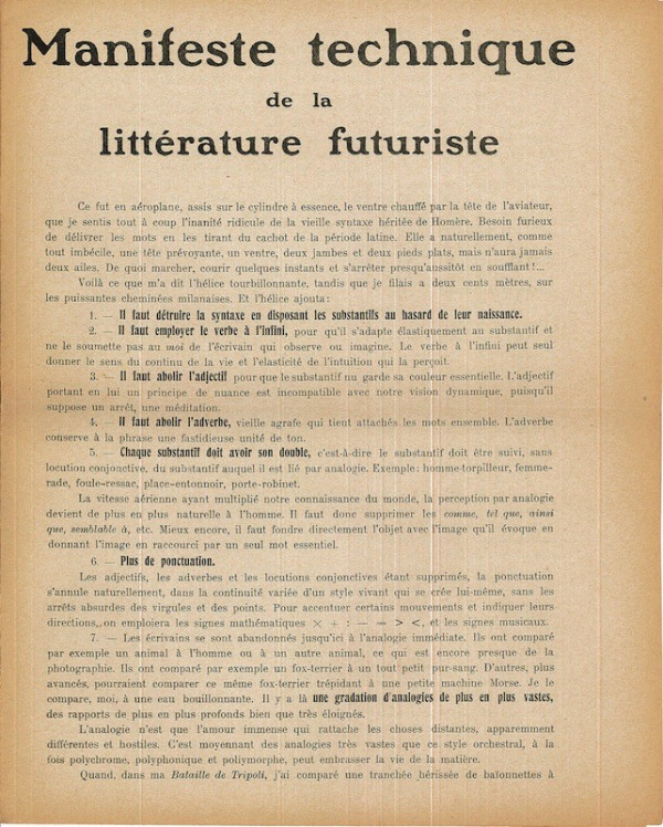 F.T. Marinetti, MANIFESTE TECHNIQUE DE LA LITTERATURE FUTURISTE, Milan, Direction du mouvement futuriste, 1912, papier imprimé, 29 X 23 cm, 4 p.