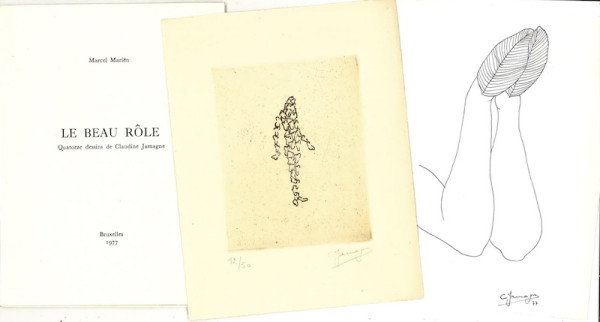 Brussels, Isy Brachot and Tom Gutt, 1977, illustrated with 14 drawings by Claudine Jamagne, 21 x 16 cm. One of 50 copies on Arches Ingres vellum accompanied by an original engraving by Claudine Jamagne, numbered, n°XII, signed by Marcel Mariën and Claudine Jamagne. Enriched with an original ink drawing signed and dated 1977 by Claudine Jamagne (16537 FD).