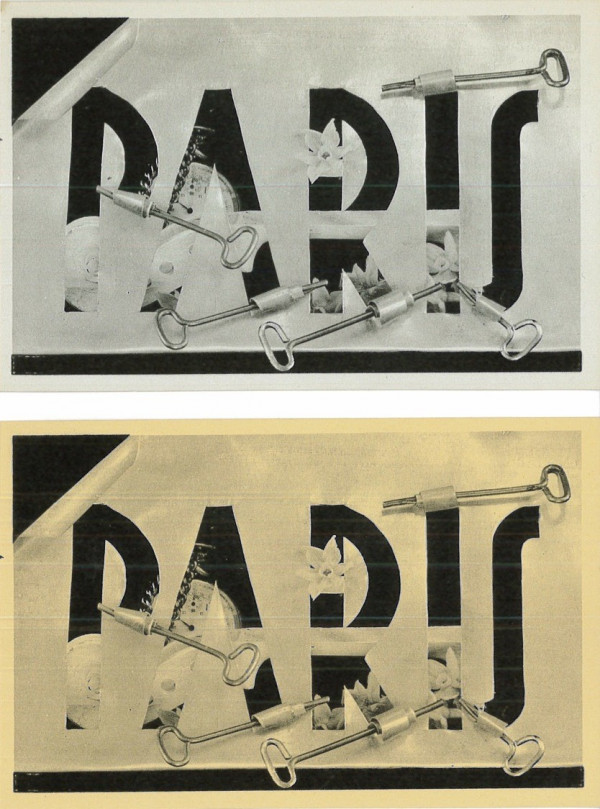 Carte surréaliste, Paris, Georges Hugnet, 1937, papier bleu ou papier jaune imprimé, 9 X 14 cm. Décolorations