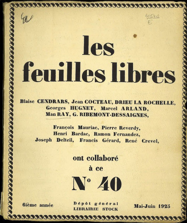 Number 40, May-June 1925, 22.5 x 19 cm. Magazine published in Paris under the direction of Maurice Raval, with a deposit at the Stock bookstore. Contributions from Blaise Cendrars, Jean Cocteau, Drieu La Rochelle, Georges Hugnet, Marcel Arland, Georges Ribemont-Dessaignes… Illustrated by Man Ray (10540 E).
