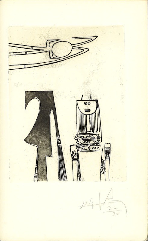 “Surrealist Communication, issue number 4, new series, January 1955, 28.5 x 18.5 cm, 64 pages, illustrations. One of the 30 deluxe edition copies containing an original drypoint etching by Wifredo Lam numbered 26/30 and signed by the artist. Bound by Mercher, in slipcase (15840 CH).”