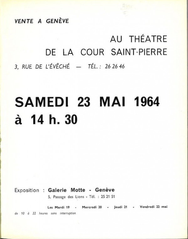 Sales catalog, Motte Gallery, Geneva, at The Theatre of the Cour Saint-Pierre, May 23, 1964. (7380 E)